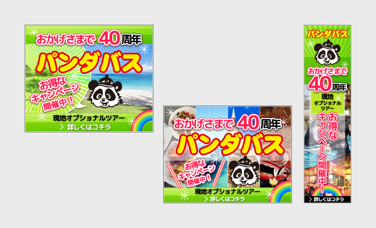 アジアを中心に旅行サービスを提供する会社。40周年時キャンペーンを展開するためのバナーおよびオプショナルツアーを案内するバナーを制作させていただきました。